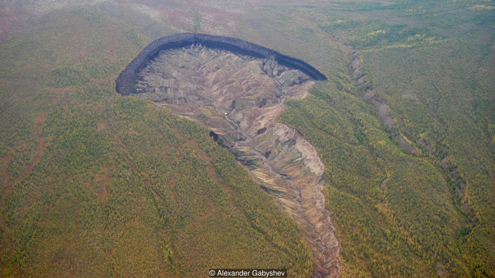 The Batagaika crater is a thermokarst depression in the form of a one kilometre-long gash up to 100 metres deep, and growing, in the East Siberian taiga, in the Sakha Republic in Russia. The land began to sink due to the thawing permafrost in the 1960s after the surrounding forest was cleared. Flooding also contributed to the enlargement of the crater. Archeologists have found ice age fossils buried in the mud around the rim of the crater. The rim is extremely unstable as there are regular landslides into the crater and the permafrost is constantly thawing. The crater is currently growing in size. Source: Wikipedia.
