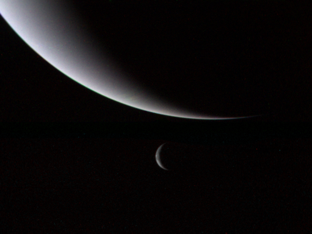 Neptune and its Moon Triton Science Space Most Beautiful Picture February 5, 2018 Spread the love Neptune and its Moon Triton, Voyager 2, 1989. Photo: NASA Spread the love