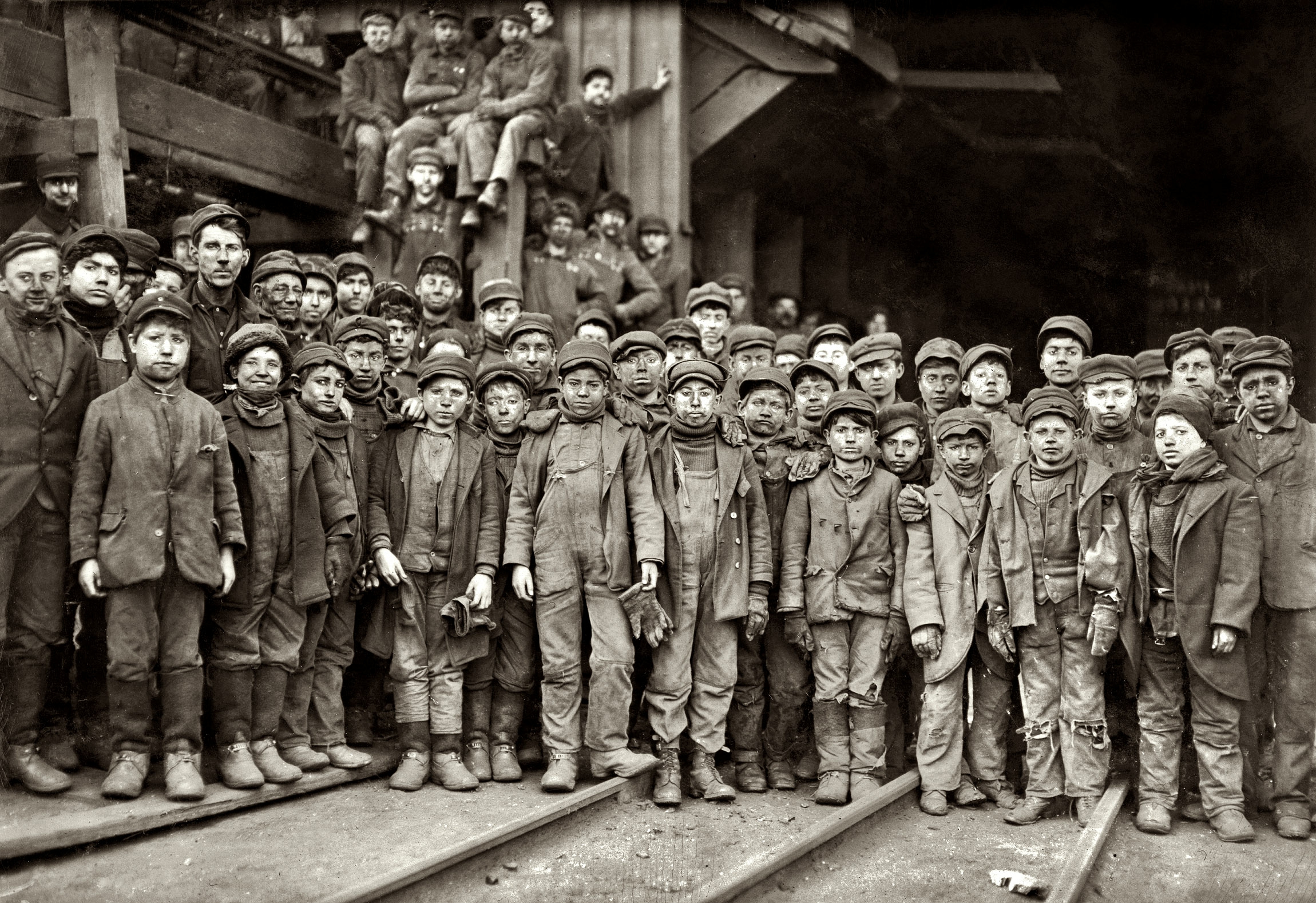 Grimy young boys pause in their work at the Pennsylvania Coal Company’s mine in South Pittston, PA, USA. Many of these boys are no more than 10 years old, and some are even younger.